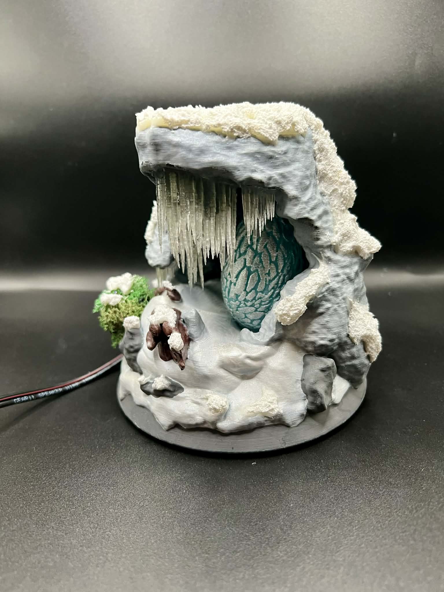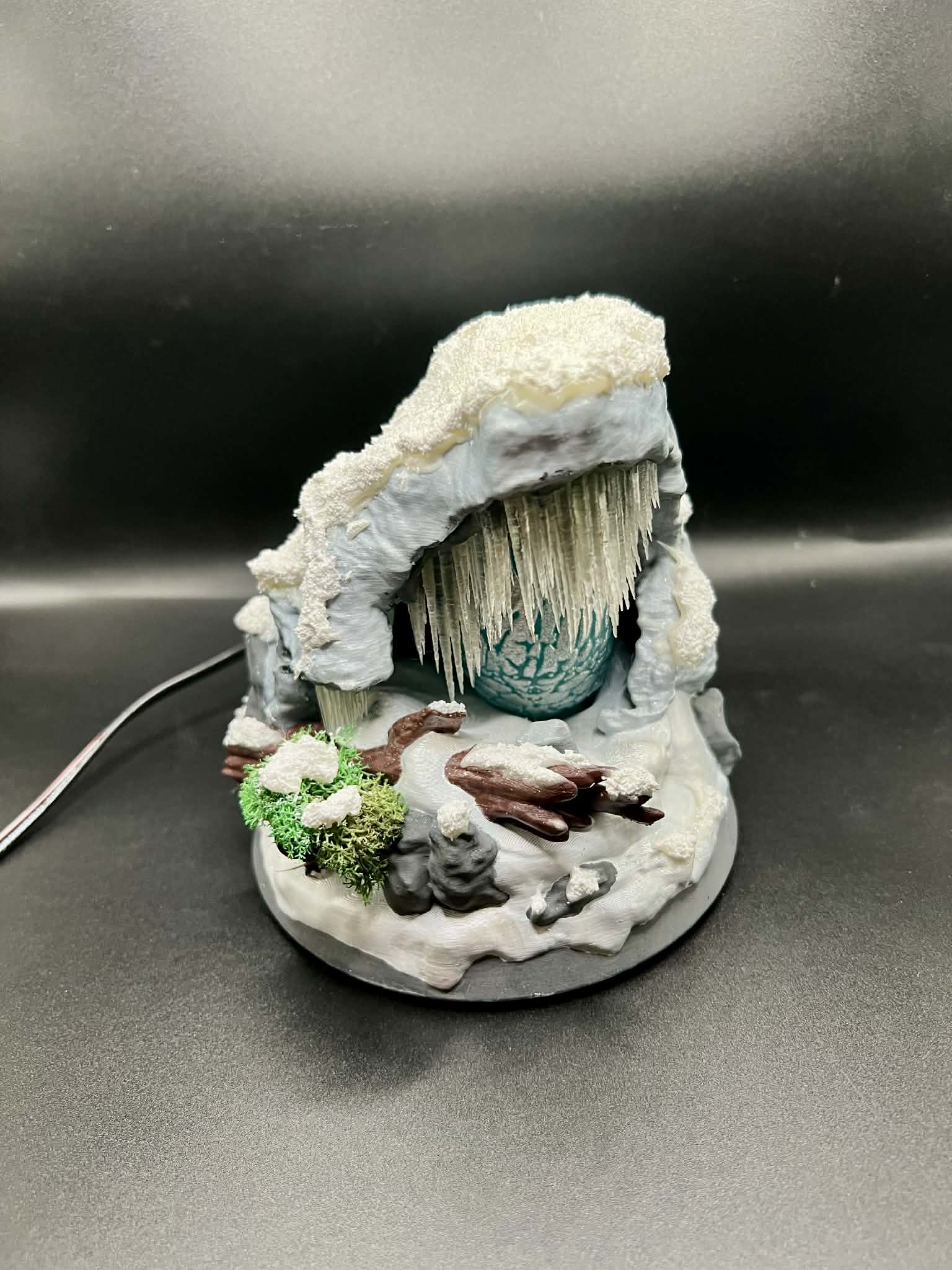 This handcrafted Ice Wyvern Egg Nest biome is inspired by the iconic frozen caves of ARK, featuring realistic snow textures, jagged ice formations, hanging icicles, and a glowing ice wyvern egg centerpiece. Designed to feel like it was pulled directly from the map, this piece is perfect for ARK players, collectors, and gamers who love immersive display pieces.